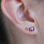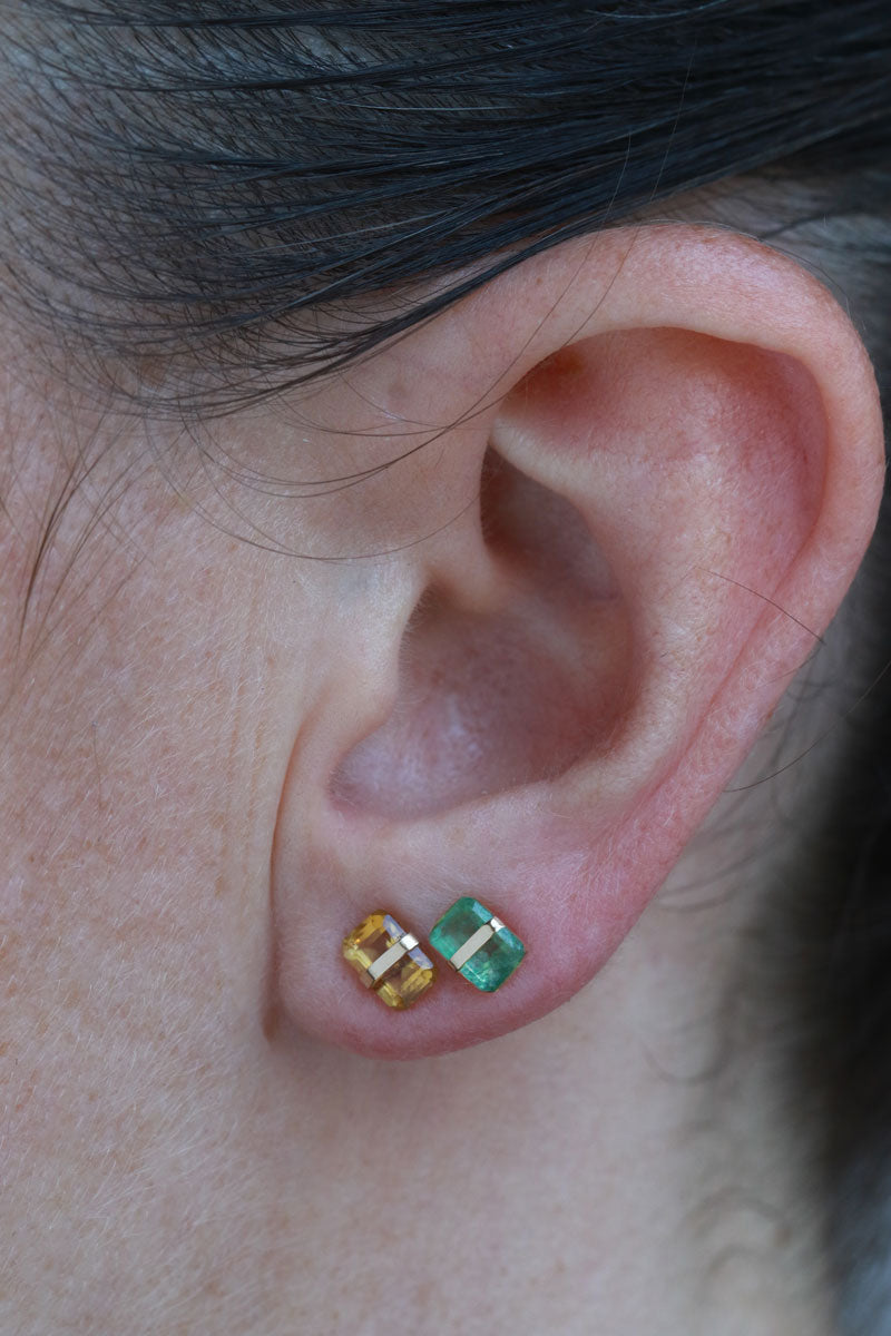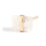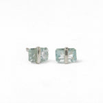 Each baguette cut stone measures approximately 4x6mm and is wrapped with a delicate gold or silver bezel wire. Finished with a standard ear post and our signature silicone wrapped gold or silver ear nut.