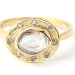 This one of a kind ring features a large clear freeform diamond surrounded by a halo of silver mist 2mm diamonds.